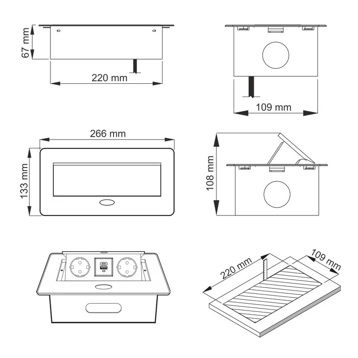 Proportiile de 266 x 133 mm permit pozitionarea separata a prizelor Schuko fata de porturile USB, facilitand utilizarea simultana a tuturor interfetelor.