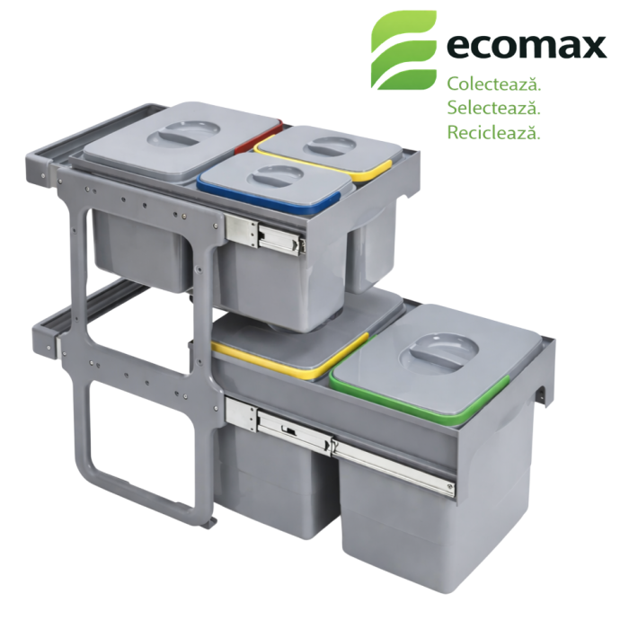 Cosul de gunoi pentru colectare selectiva cu 5 compartimente mobile (2x15 litri, 1x12 litri, 2x5 litri) este prevazut cu ghidaje din otel galvanizat care pot sustine o greutate de pana la 30 kg.