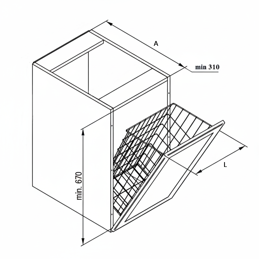 Cosul pentru rufe murdare este o solutie eleganta si functionala, conceputa pentru a fi integrata discret in mobilier. Realizat din sarma metalica gri, ofera rezistenta, stabilitate si o buna ventilatie a rufelor, prevenind acumularea mirosurilor neplacute. Forma sa inclinata permite o deschidere usoara si acces rapid la interior, fiind ideal pentru montaj pe usa frontala a unui corp de mobilier cu mecanism rabatabil. Designul sau minimalist si finisajul curat il fac potrivit pentru bai moderne, dressinguri sau spatii compacte unde ordinea si eficienta sunt esentiale.