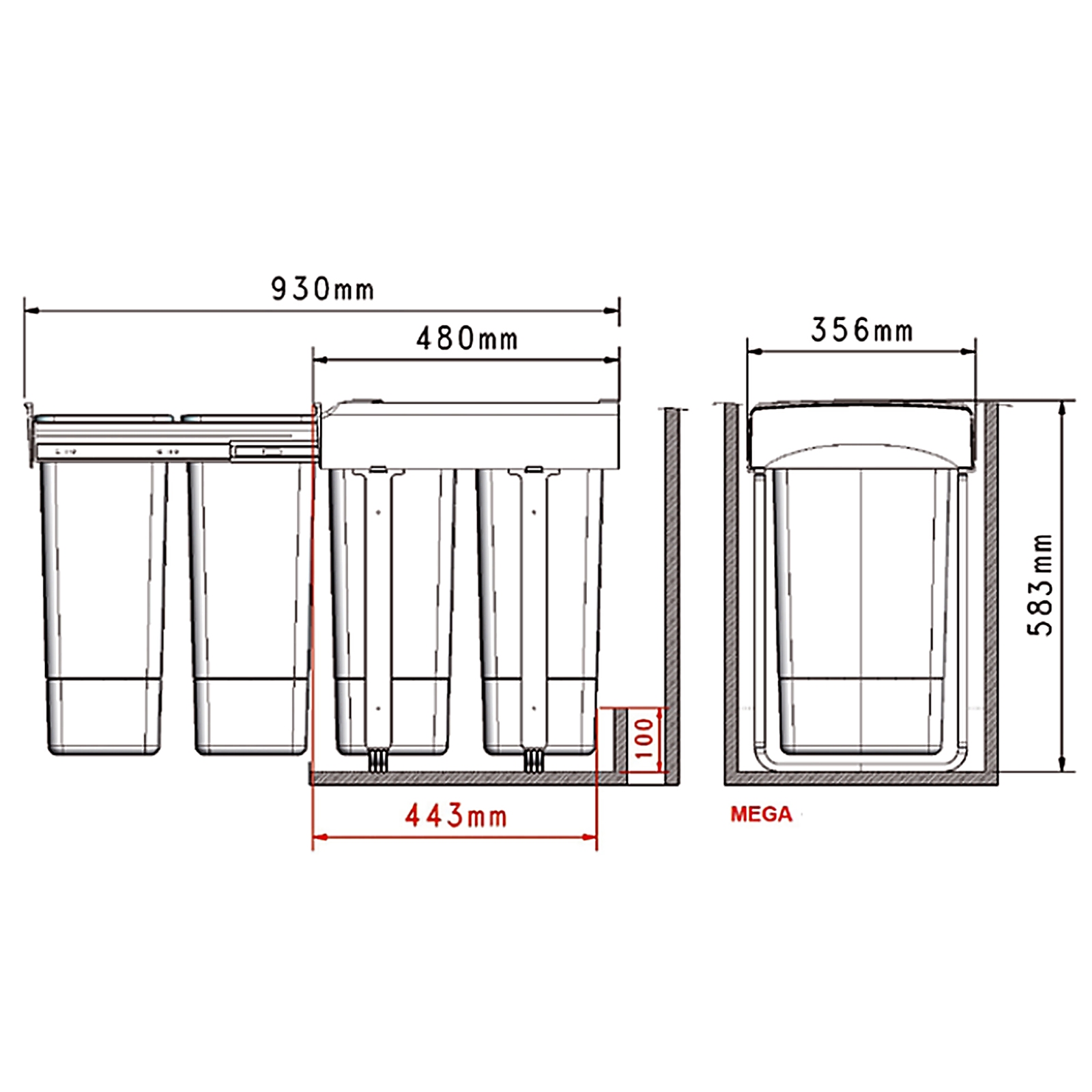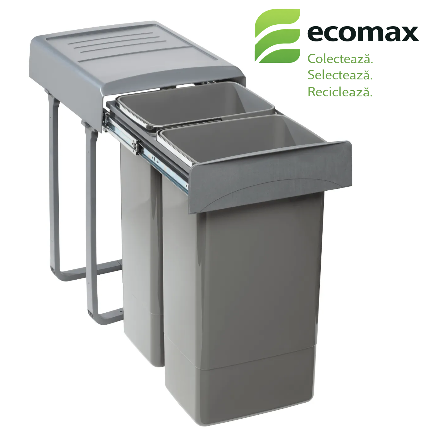 Cosul de gunoi pentru colectare selectiva cu 2 compartimente mobile este prevazut cu ghidaje din otel galvanizat care pot sustine o greutate de pana la 50 kg. Extragerea se face pe glisiere cu bile cu extragere totala si amortizare. Compartimentele mobile prevazute cu manere si capacul cosului sunt demontabile si se pot curata foarte usor chiar si in masina de spalat vase. Cosul este foarte rezistent fiind confectionat din polipropilena cu fibra de sticla. Cosul de gunoi poate fi montat in corp cu adancime de minim 500 mm, latime de minim 376 mm si inaltime de minim 603 mm. Montajul se realizeaza cu usurinta in maxim 3 minute.