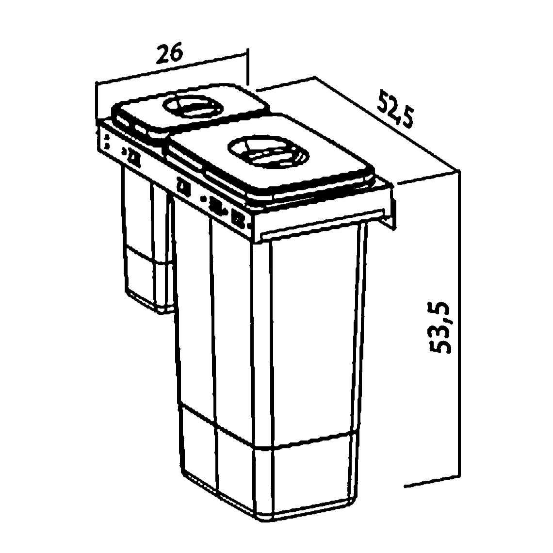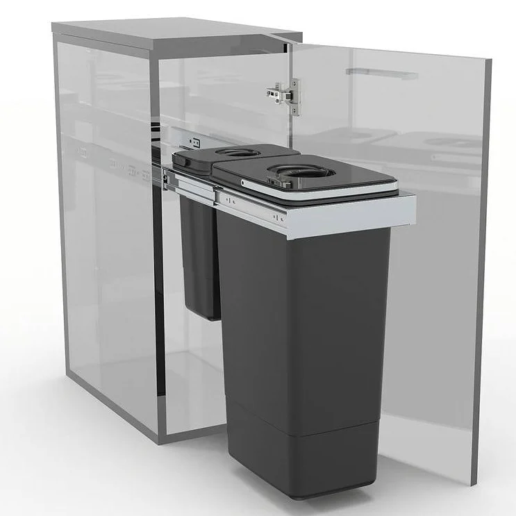 Cele doua recipiente de colectare, prevazute cu manere si capace, unul cu capacitate de 26 de litri, iar al doilea, cu capacitate de 7 litri pentru deseuri de dimensiuni mai mici, au ca suport un cadru rezistent din otel inoxidabil. Extragerea cosului de gunoi se realizeaza cu ajutorul glisierelor cu extragere totala si amortizare. Se monteaza in corp de mobila cu latime exterioara de 300 mm.