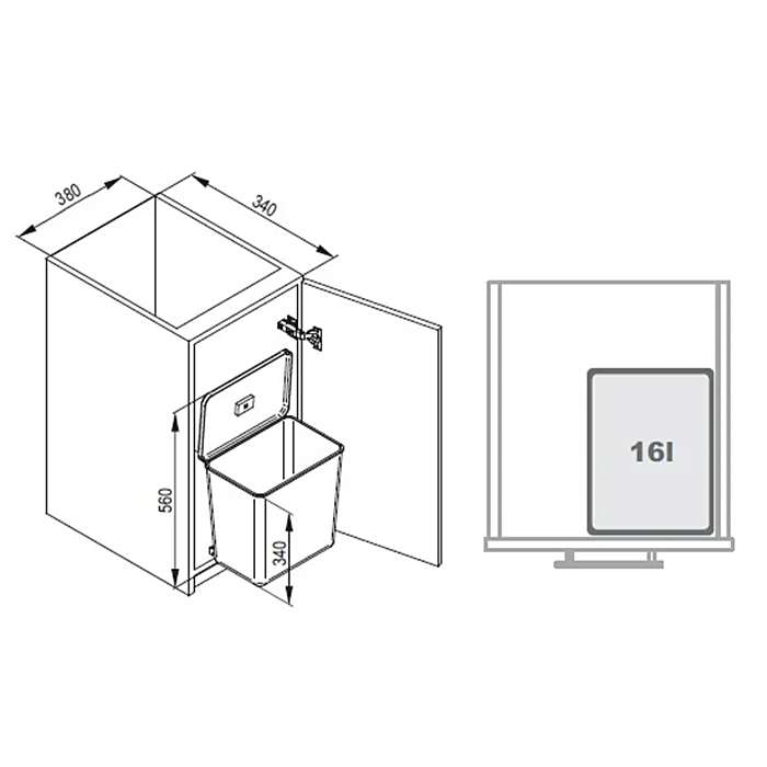 Cosul de gunoi are 2 compartimente interioare mobile de cate 8 litri fiecare, ceea ce il face usor de curatat. Este un cos rezistent confectionat din polipropilena cu fibra de sticla. Se monteaza cu cleme pe usa si pe laterala corpului, se extrage complet la deschiderea usii. Dimensiunile interioare ale corpului de mobilier in care se monteaza acest cos de gunoi trebuie sa fie: minim 380 mm latime, minim 340 mm adancime si minim 390 mm inaltime.