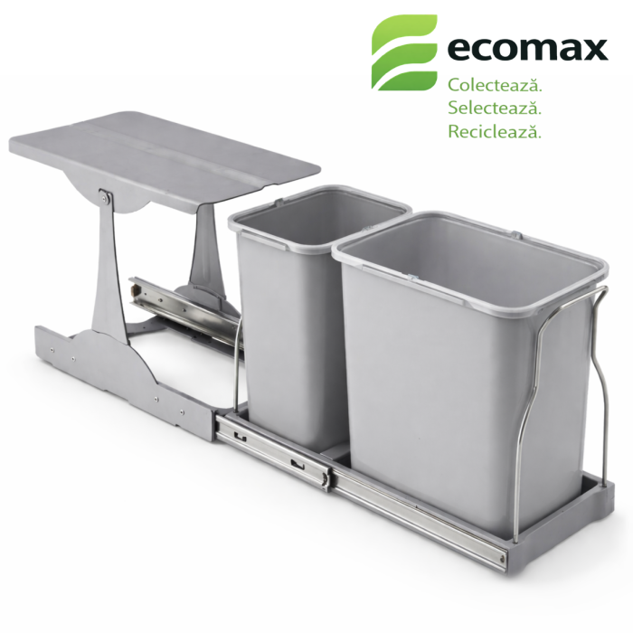 Sistemul de cosuri de gunoi  este ideal pentru colectarea selectiva a deseurilor. Este compus din 2 recipiente , unul de 8 litri si unul de 16 litri si o tavita suport, pentru stabilitate. Acest sistem de cosuri este potrivit pentru corp de mobilier cu o inaltime interioara de minim 360 mm, cu latimea interioara de minim 300 mm si cu adancimea interioara a corpului de minim 475 mm. Extragerea se face automat, odata cu deschiderea usii corpului de mobilier, prin glisare silentioasa cu tren de role si deschidere partiala. Produs complet demontabil  pentru a fi curatat foarte usor.