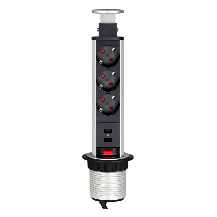 Această priză încorporabilă în blat este potrivită pentru bucătării, birouri, mese de lucru și alte spații în care este necesar acces rapid la alimentare și încărcare direct din mobilier. Poate fi folosită pentru laptopuri, telefoane, tablete sau alte dispozitive utilizate zilnic, fiind o soluție eficientă pentru mobilier de bucătărie, mobilier de birou sau amenajări cu funcționalitate extinsă. Prin finisajul de aluminiu și designul tip coloană, se integrează ușor în amenajări moderne, minimaliste, contemporane și funcționale.