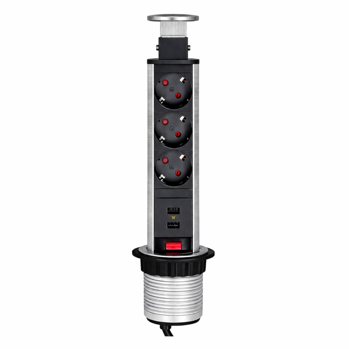 Această priză încorporabilă în blat este potrivită pentru bucătării, birouri, mese de lucru și alte spații în care este necesar acces rapid la alimentare și încărcare direct din mobilier. Poate fi folosită pentru laptopuri, telefoane, tablete sau alte dispozitive utilizate zilnic, fiind o soluție eficientă pentru mobilier de bucătărie, mobilier de birou sau amenajări cu funcționalitate extinsă. Prin finisajul inox și designul tip coloană, se integrează ușor în amenajări moderne, minimaliste, contemporane și funcționale.