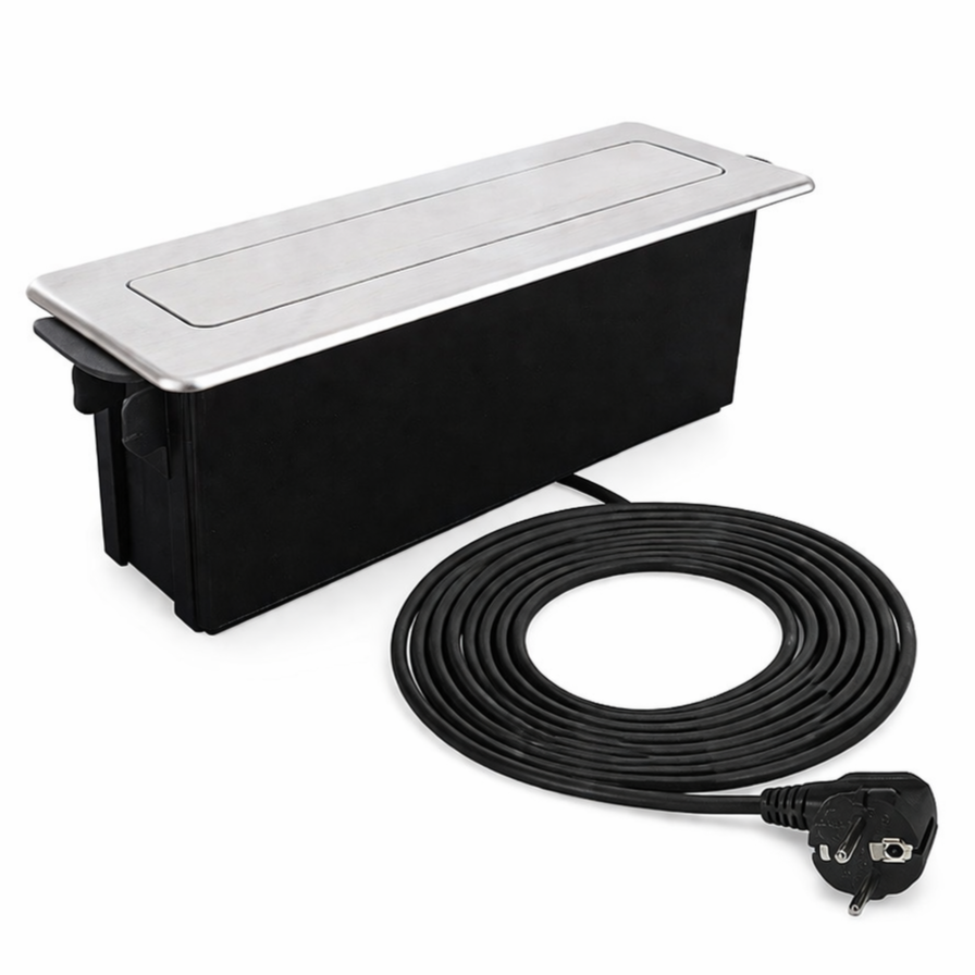 Priză încorporabilă în blat Design Light Hop Box, 3 prize Schuko, USB A + C, oțel inoxidabil periat / negru, 273 x 93 mm